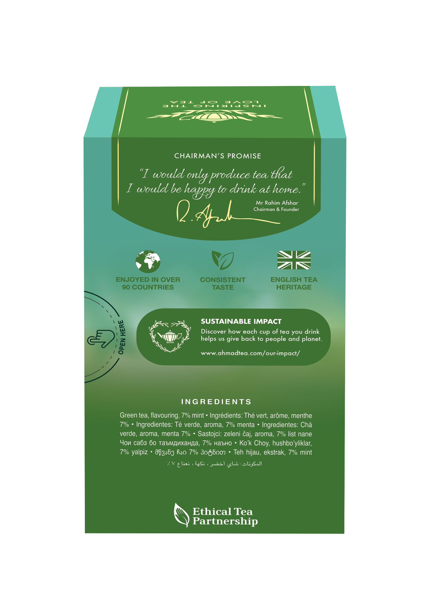 This blend is created with a base of fine green teas from the "Golden Triangle" of China with added spearmint leaf and our special mint flavouring, resulting in a refreshing minty fresh drink.